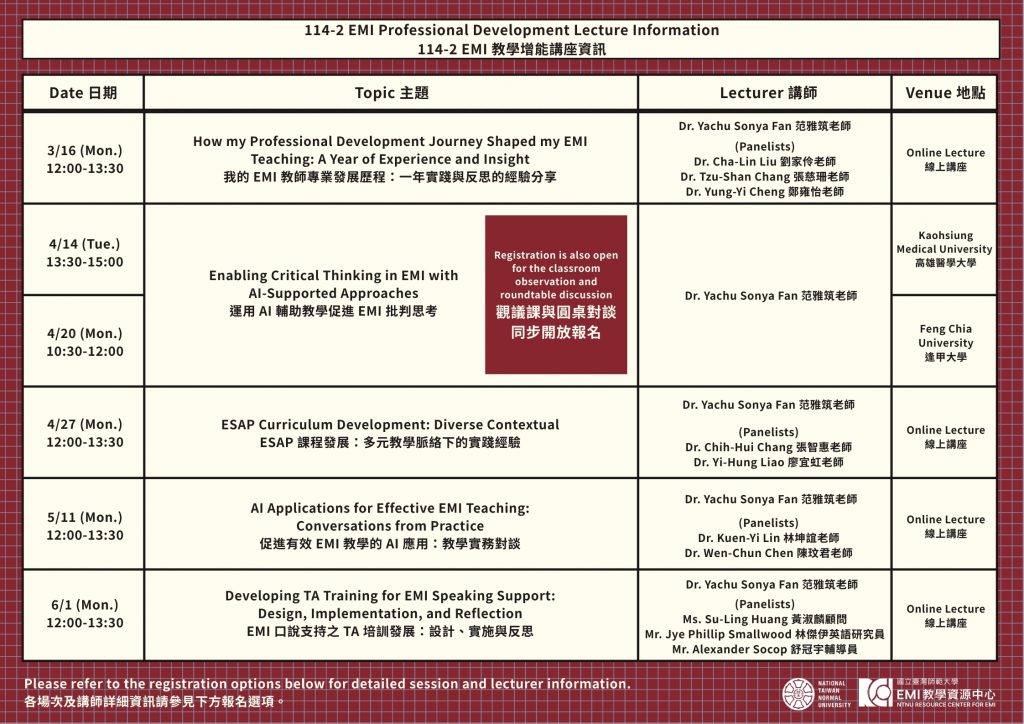 為提升教師 EMI 教學能量並促進跨校經驗交流,本學期特別規劃系列講座,邀請多位專家學者針對 AI 輔助教學、ESAP 課程發展及 TA 培訓等熱門議題進行深度分享。歡迎各位師生踴躍報名參加!