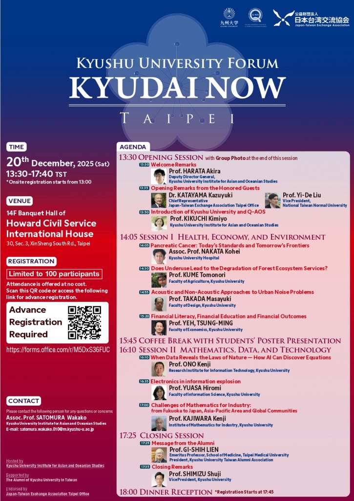 Kyushu University will hold the “KYUDAI NOW” Forum on the afternoon of December 20 at the Howard Civil Service International House. The program covers a wide range of topics—including health, economy, environment, data, and technology—featuring several Kyushu University professors who will share their latest research and insights.
