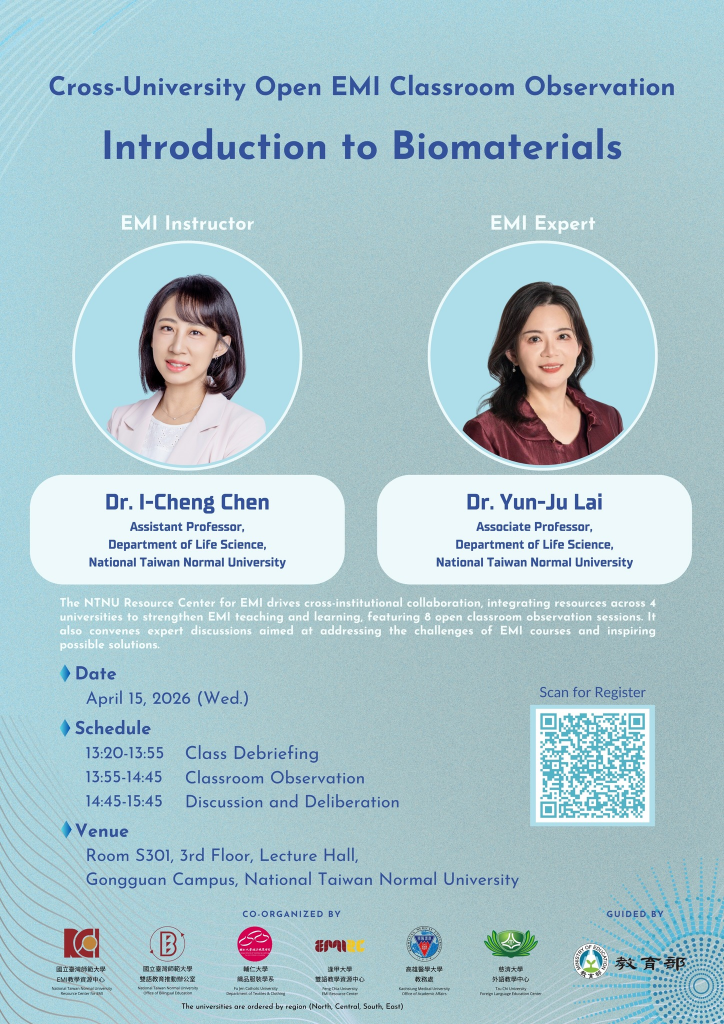 Join us for an open classroom observation and professional discussion led by Asst. Prof. I-Cheng Chen from the Department of Life Science at NTNU. We cordially invite faculty and staff from higher education to participate.